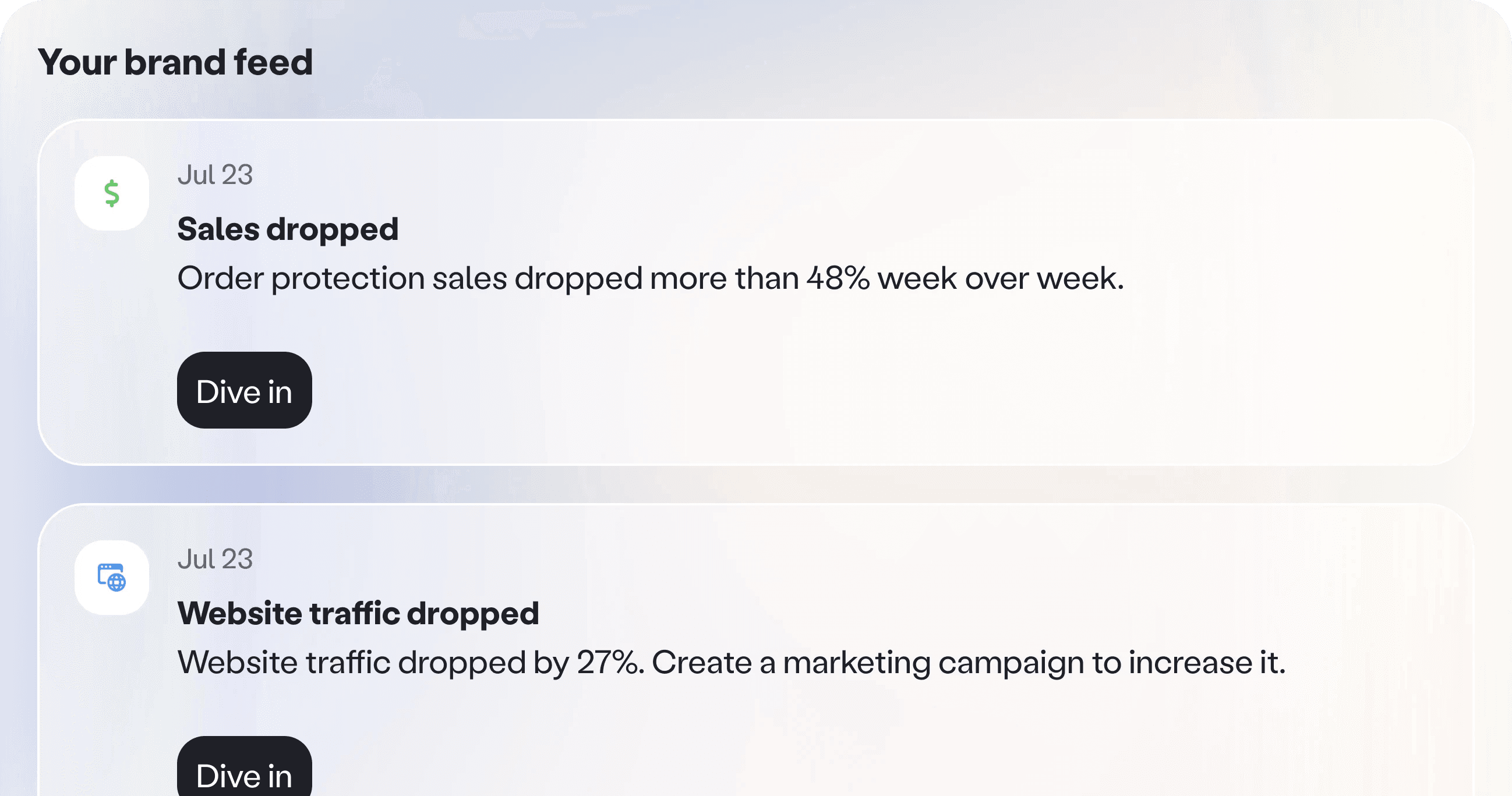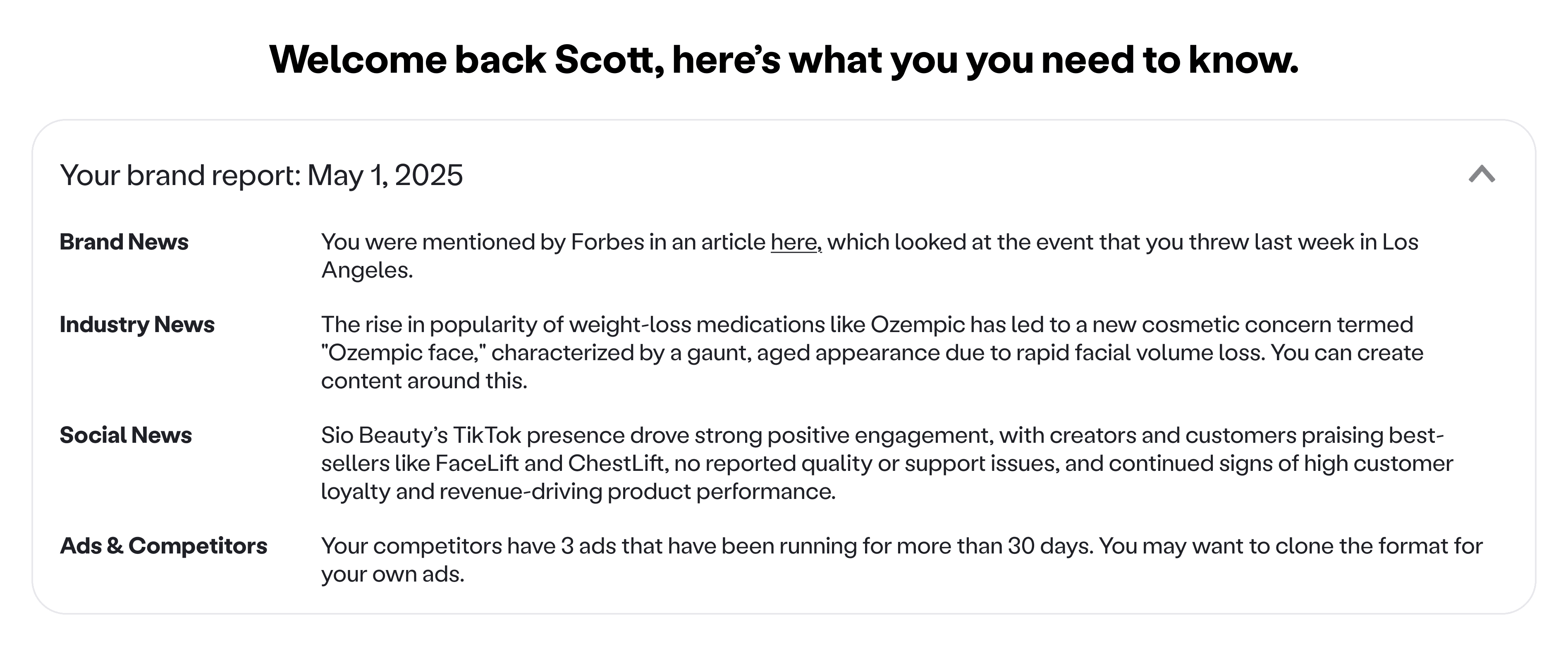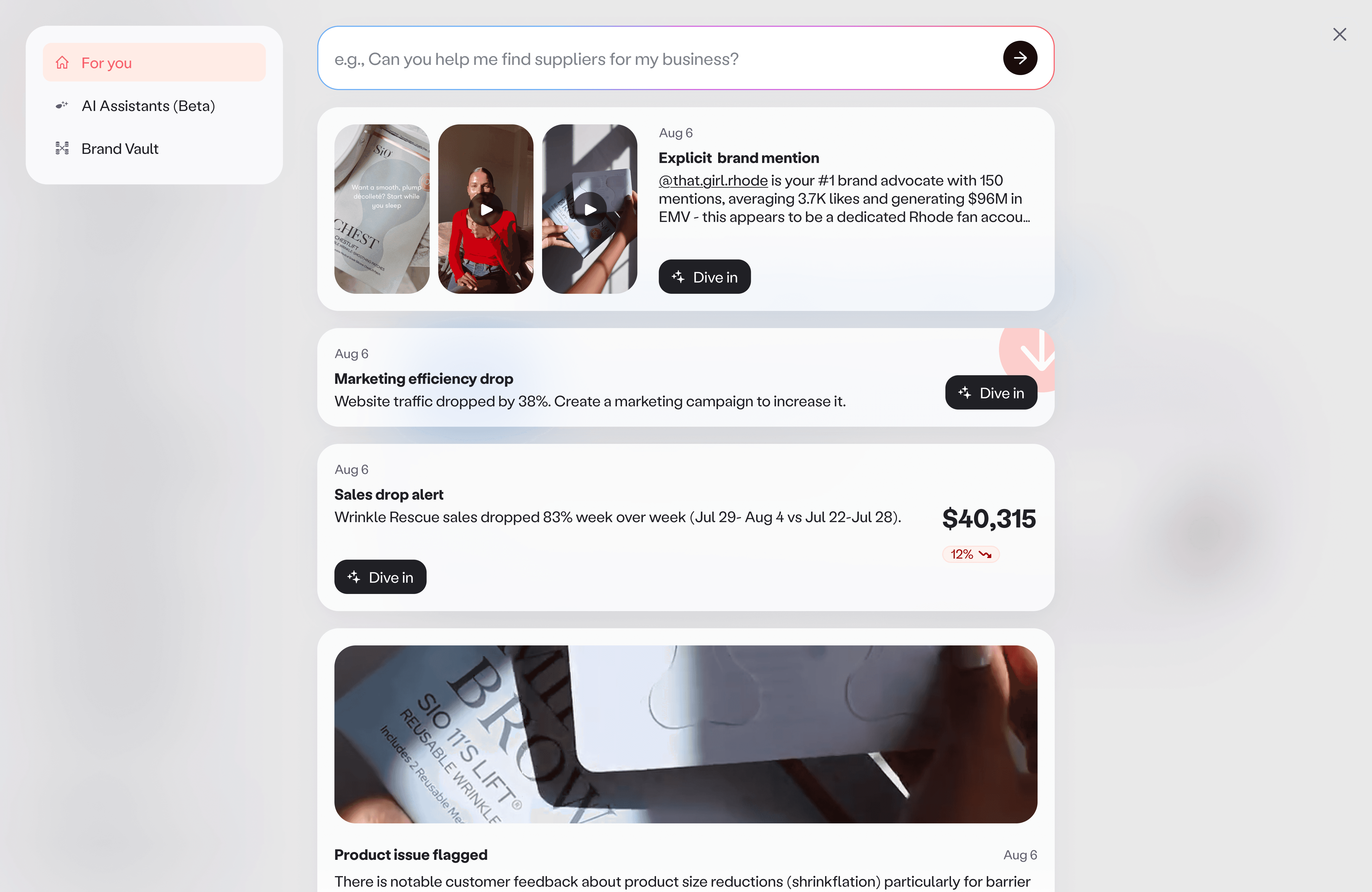 Value on arrival. The moment a user logs in, they see a list of brand updates they can act on right away. No prompting required, just clear signals and suggested next steps.