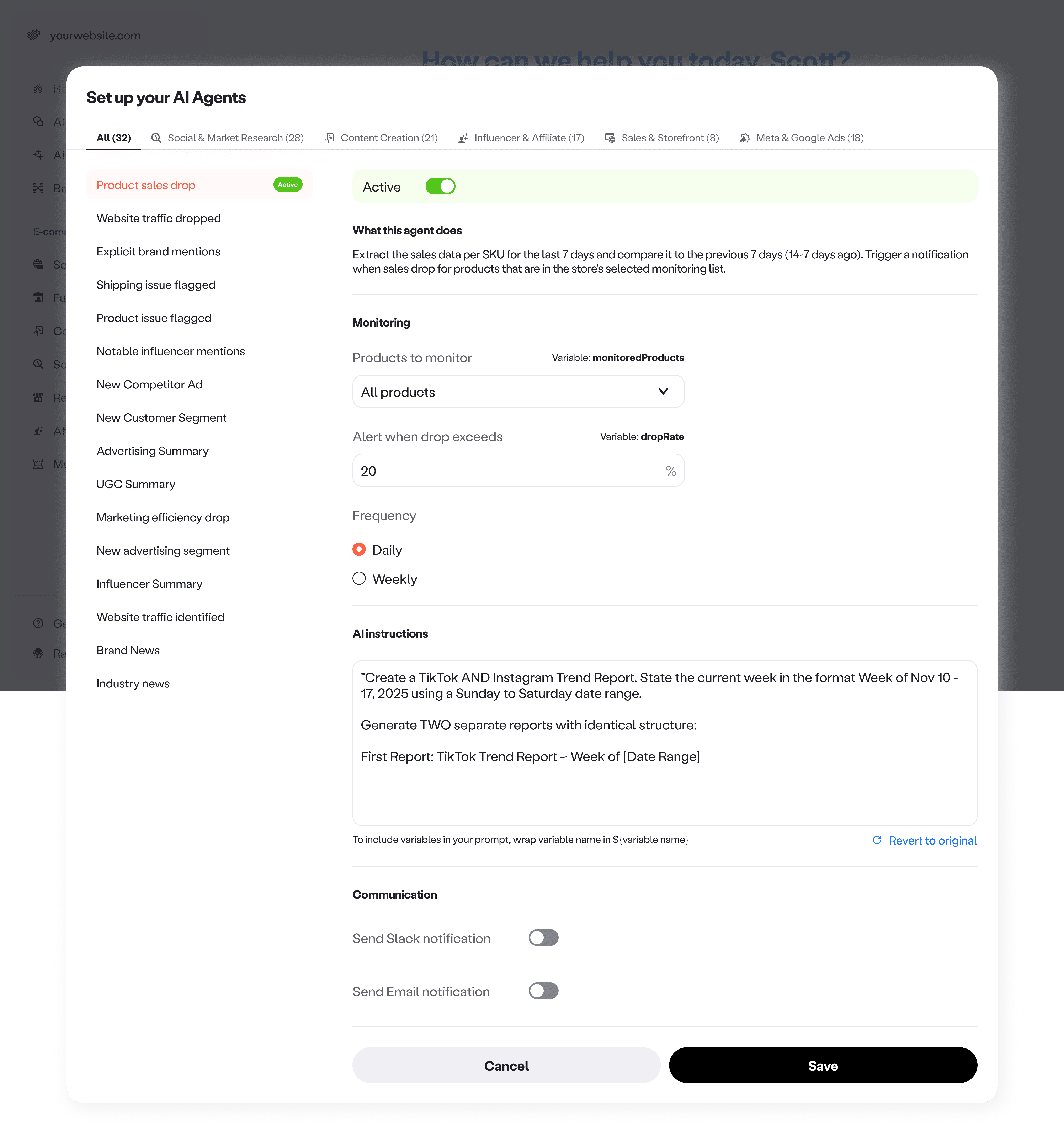 Configurability. Once the feed proved demand, we introduced simple controls to turn monitors on or off and update instructions in plain language, so the feed matches what each brand actually cares about.