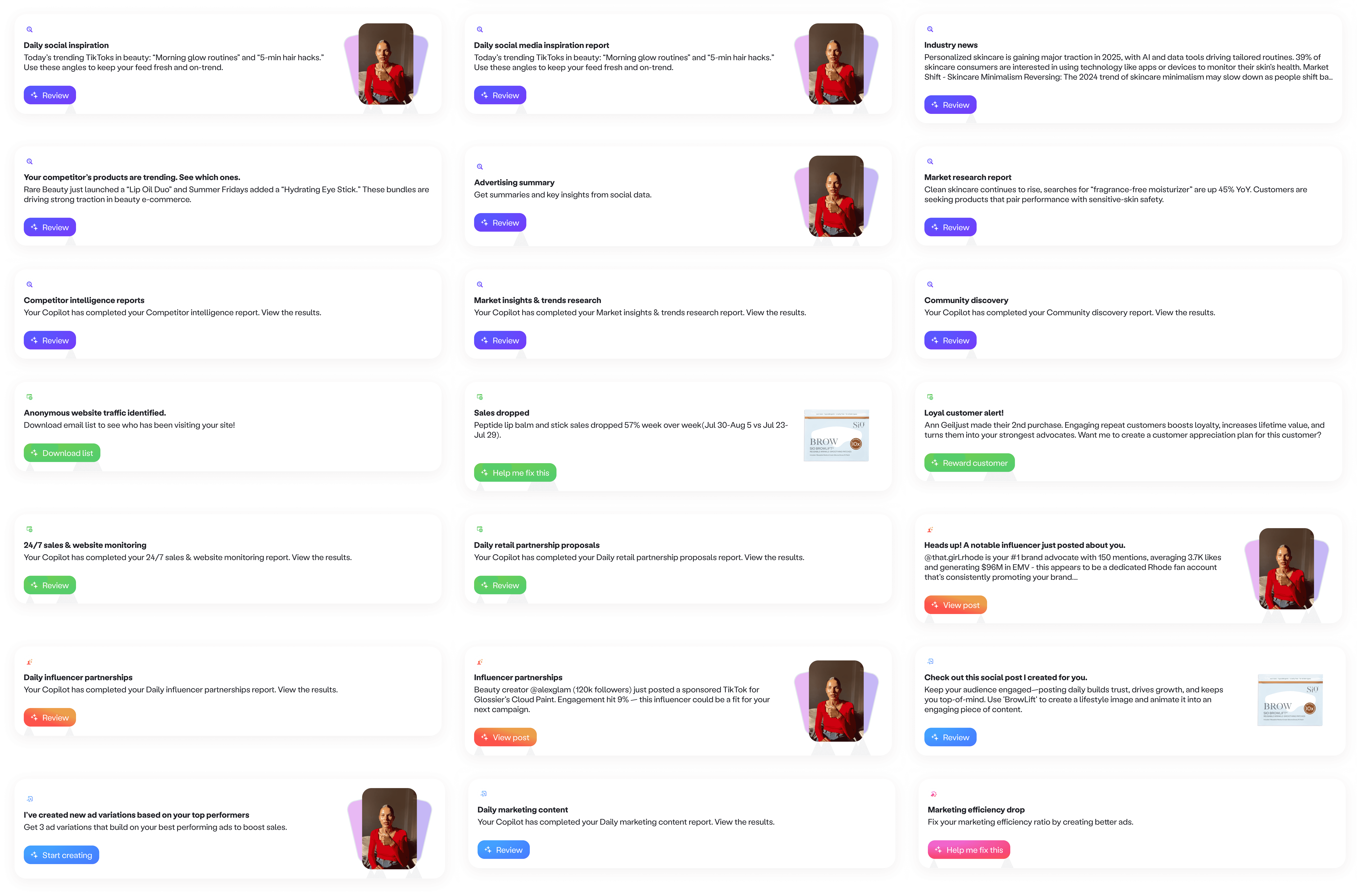 Shipped 25 insights. We pressure tested a list of potential insights with a few clients, then shipped 25 insights across sales and storefront, website, social, marketing, and content. We prioritized the most common questions brands had, and chose signals that were easy to validate.