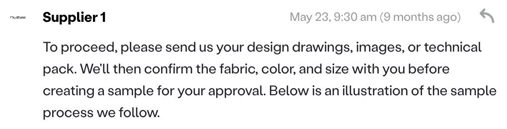 Process. I reviewed past brand-supplier conversations and looked for patterns in what led to quick quotes versus stalled threads. I also ran reviews with the sourcing team to validate what suppliers actually need.