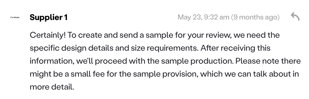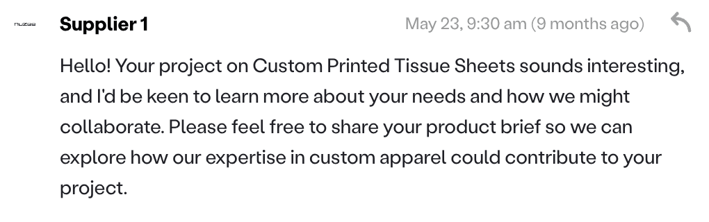 Problem. Those first messages often miss the specs and constraints suppliers need to act on. Suppliers either do not respond, or the conversation turns into endless follow ups to gather basic info. Either way, sourcing stalls and fewer conversations move to quotes, samples, and invoices.