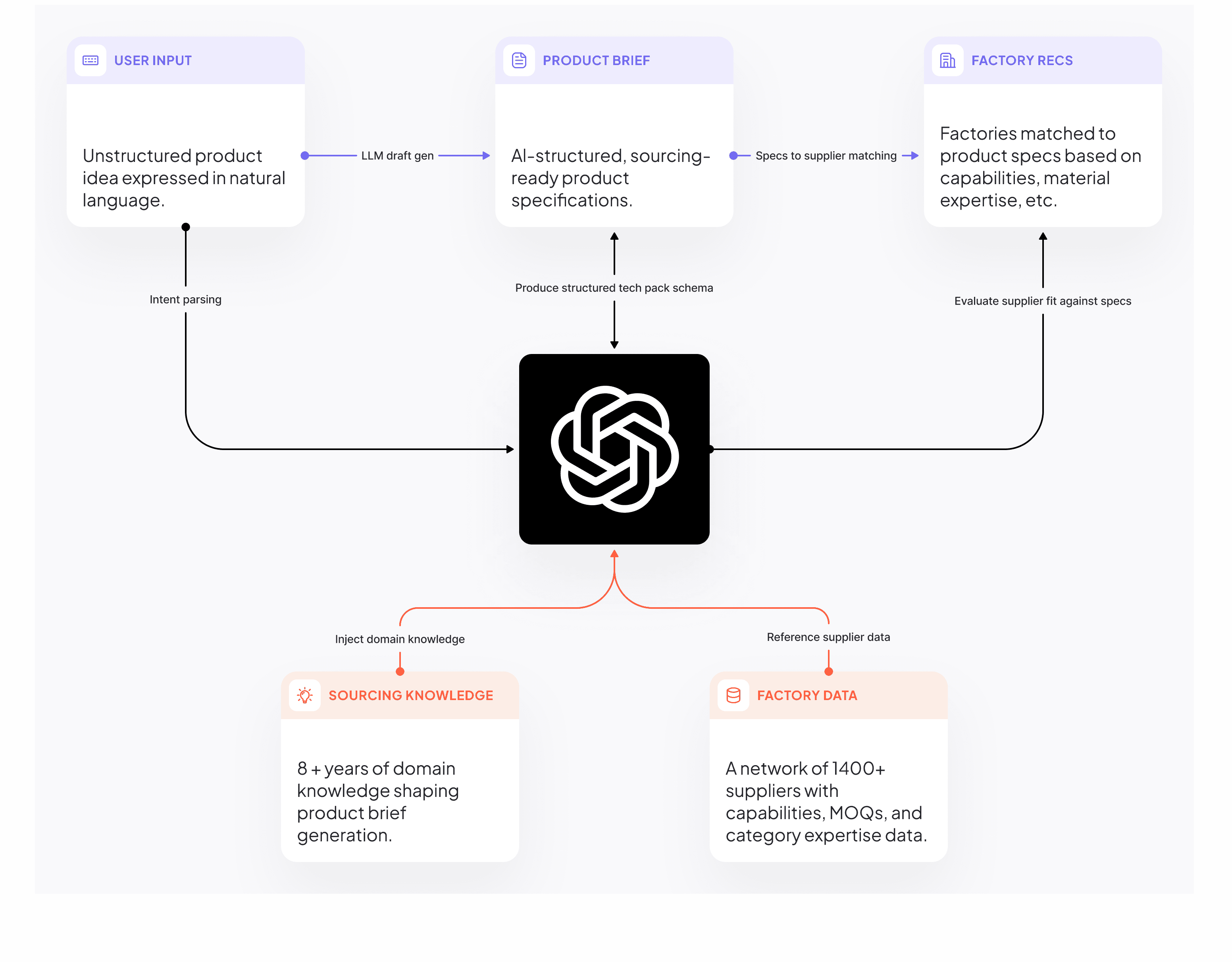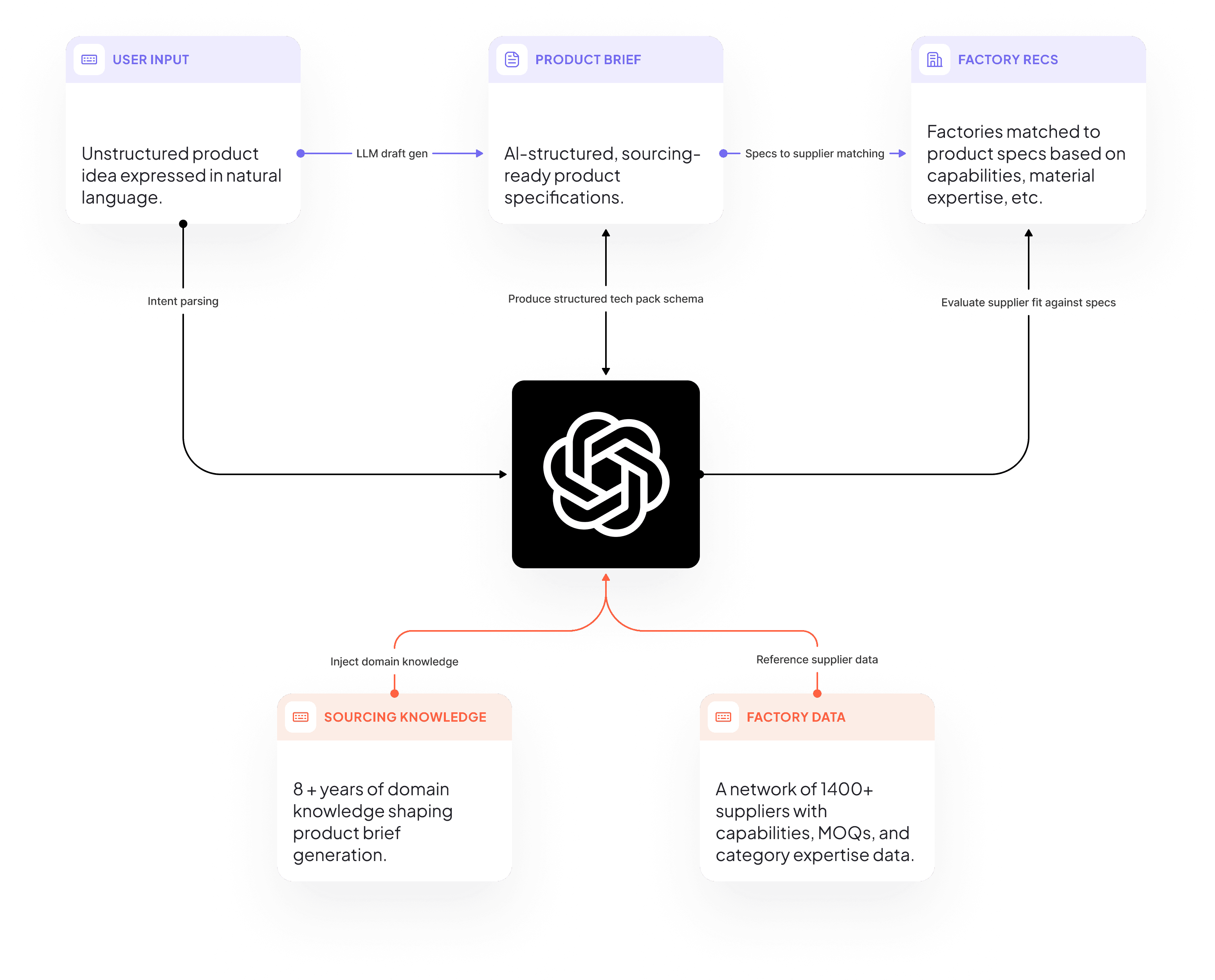 Leveraging AI. AI has become increasingly good at turning messy, unstructured input into clear, structured information.We used it as a guide that helps brands flesh out early ideas, learn what suppliers need, and turn that input into artifacts suppliers can act on. The goal was not automation for its own sake. It was education and speed, with transparency and user control.