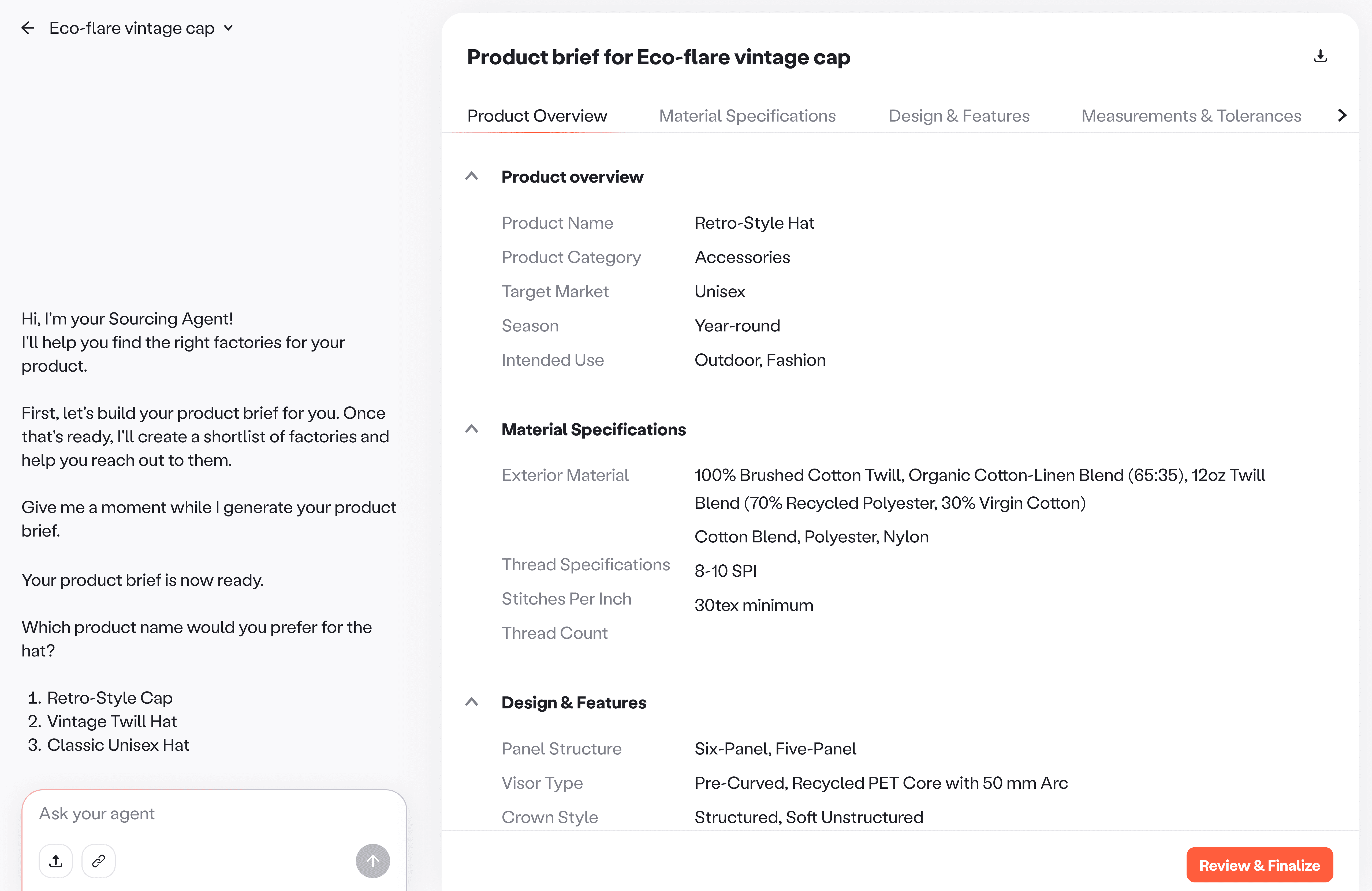 Product brief as the core artifact. User input becomes a structured product brief that captures specs plus commercial constraints. Because it directly impacts response rates and sourcing outcomes, it was designed as the primary workspace, always visible, editable, and supported by AI guidance.